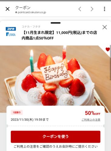 楽天ペイアプリ内のクーポンを見ていたら、コナカの誕生日クーポンを見付けました。 11000円(税込み)までの店内商品1点が50%オフになるクーポンです。 スーツのような高額商品以外の買い物は誕生月に買うとお得になりますね。 コナカがいつから誕生日クー…