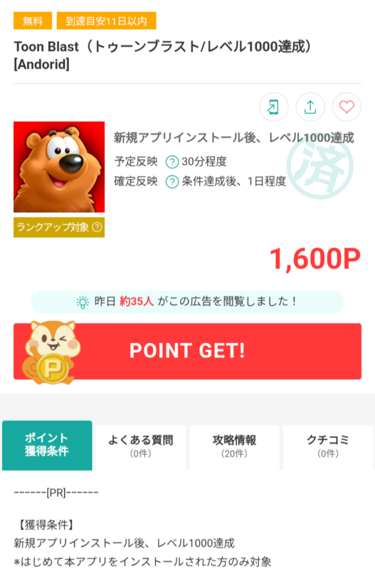 モッピーの案件でトゥーンブラストの条件をクリアしました。